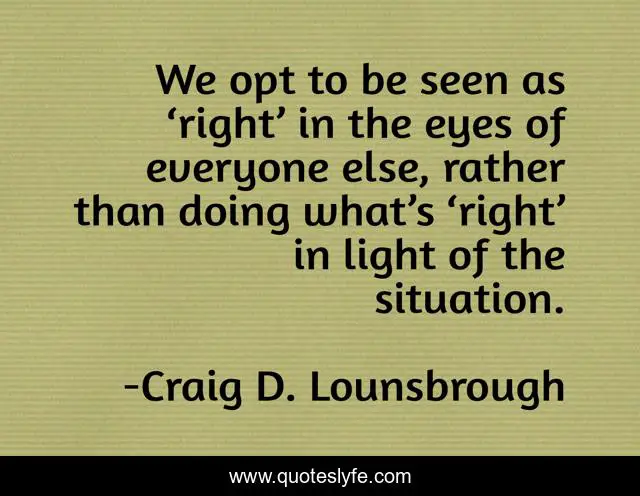 This page presents the quote "We opt to be seen as ‘right’ in the eyes of everyone else, rather than doing what’s ‘right’ in light of the situation.". Author of this quote is Craig D. Lounsbrough. .