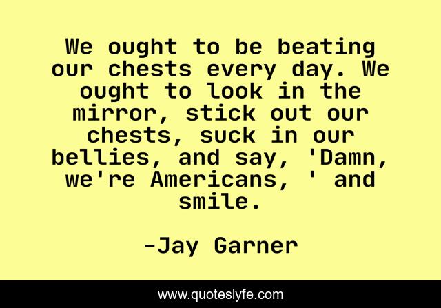This page presents the quote "We ought to be beating our chests every day. We ought to look in the mirror, stick out our chests, suck in our bellies, and say, 'Damn, we're Americans, ' and smile.". Author of this quote is Jay Garner. This quote is about every day, day, mirror,.