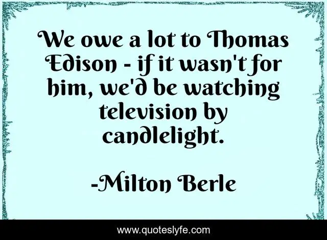 This page presents the quote "We owe a lot to Thomas Edison - if it wasn't for him, we'd be watching television by candlelight.". Author of this quote is Milton Berle. This quote is about television, him, watching,.