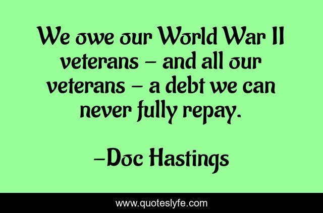 This page presents the quote "We owe our World War II veterans - and all our veterans - a debt we can never fully repay.". Author of this quote is Doc Hastings. This quote is about world, debt, veterans,.