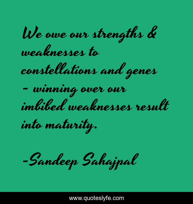 This page presents the quote "We owe our strengths & weaknesses to constellations and genes - winning over our imbibed weaknesses result into maturity.". Author of this quote is Sandeep Sahajpal. .