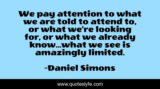 This page presents the quote "We pay attention to what we are told to attend to, or what we're looking for, or what we already know...what we see is amazingly limited.". Author of this quote is Daniel Simons. This quote is about mental-limits, psychology,.