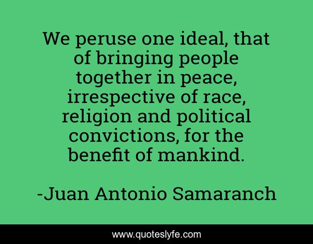 This page presents the quote "We peruse one ideal, that of bringing people together in peace, irrespective of race, religion and political convictions, for the benefit of mankind.". Author of this quote is Juan Antonio Samaranch. This quote is about peace, together, history,.
