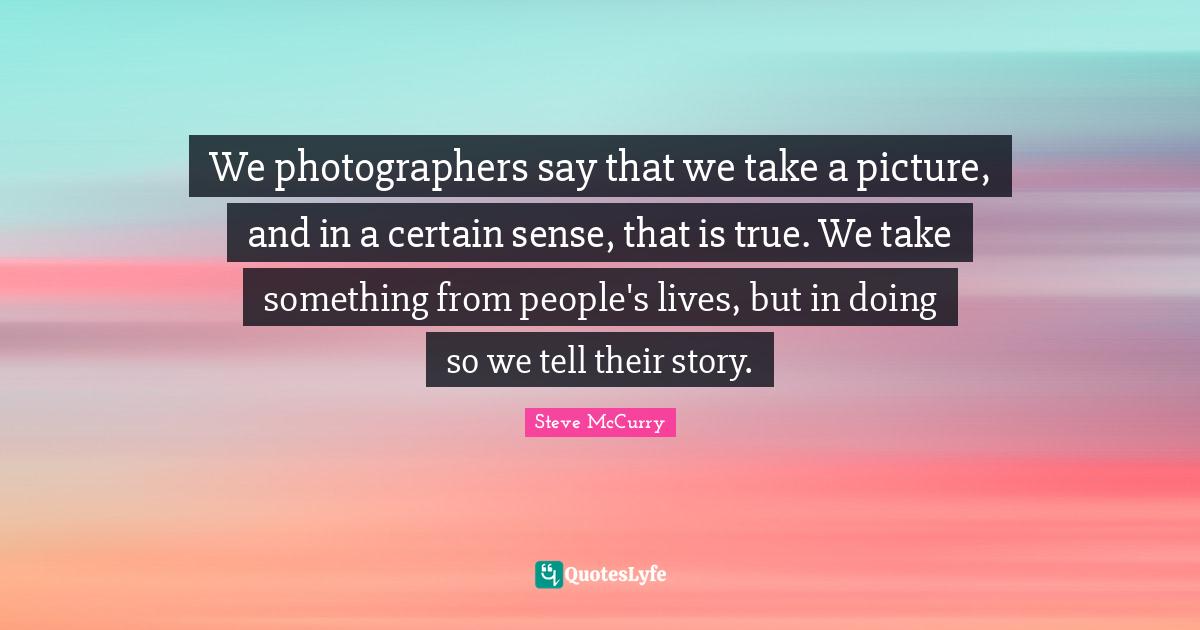 This page presents the quote "We photographers say that we take a picture, and in a certain sense, that is true. We take something from people's lives, but in doing so we tell their story.". Author of this quote is Steve McCurry. This quote is about certain, stories, people, photographer,.