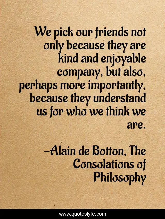 "Alain de Botton, The Consolations of Philosophy Quotes." Quoteslyfe.com, 2025. Sat. 06 Dec. 2025. <https://www.quoteslyfe.com/quote/We-pick-our-friends-not-only-because-50665>.