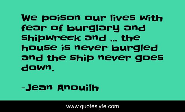 This page presents the quote "We poison our lives with fear of burglary and shipwreck and ... the house is never burgled and the ship never goes down.". Author of this quote is Jean Anouilh. This quote is about success, happiness,.