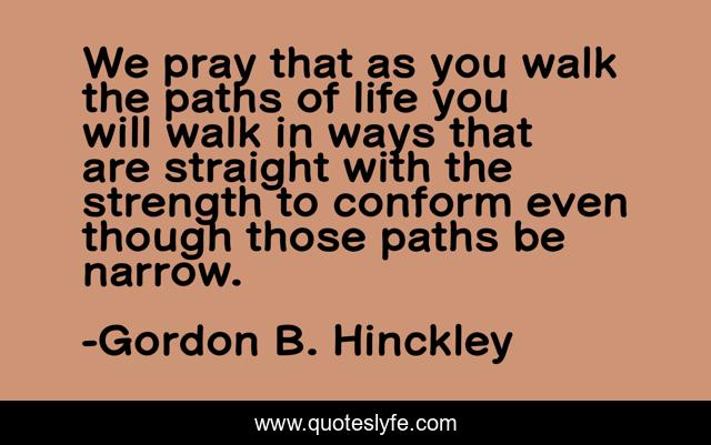 This page presents the quote "We pray that as you walk the paths of life you will walk in ways that are straight with the strength to conform even though those paths be narrow.". Author of this quote is Gordon B. Hinckley. This quote is about pray, conform, life,.