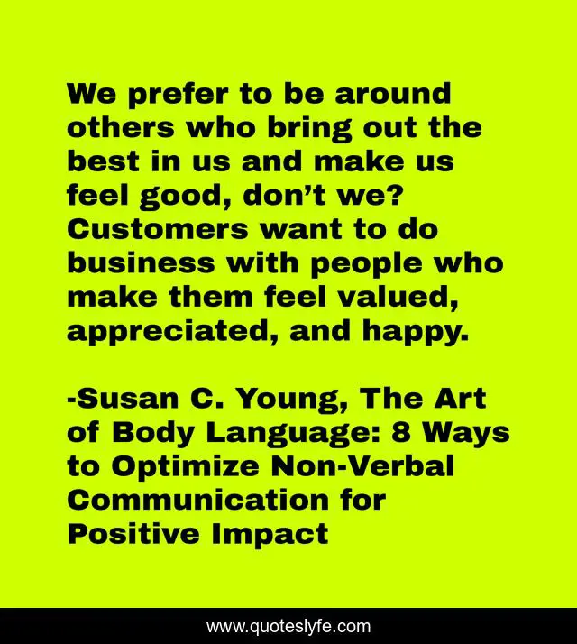 This page presents the quote "We prefer to be around others who bring out the best in us and make us feel good, don’t we? Customers want to do business with people who make them feel valued, appreciated, and happy.". Author of this quote is Susan C. Young, The Art of Body Language: 8 Ways to Optimize Non-Verbal Communication for Positive Impact. This quote is about relationship, communication-skills, body-language, quotes-by-susan-c-young, behaviour, attitude, motivational-speaker-susan-young, energy, mindset,.