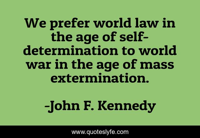 This page presents the quote "We prefer world law in the age of self-determination to world war in the age of mass extermination.". Author of this quote is John F. Kennedy. This quote is about world, age, law,.