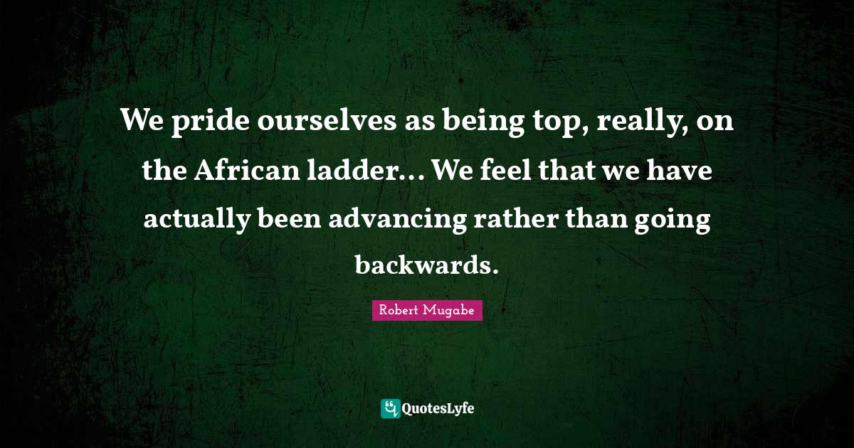 This page presents the quote "We pride ourselves as being top, really, on the African ladder... We feel that we have actually been advancing rather than going backwards.". Author of this quote is Robert Mugabe. This quote is about pride, advancing, ladders, backwards,.