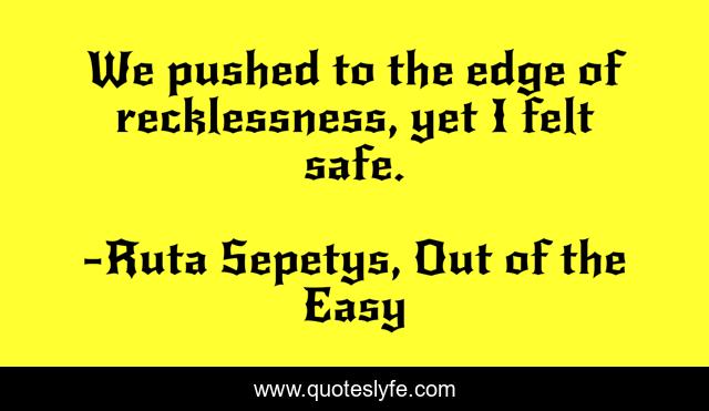 This page presents the quote "We pushed to the edge of recklessness, yet I felt safe.". Author of this quote is Ruta Sepetys, Out of the Easy. This quote is about live, safe, reckless,.
