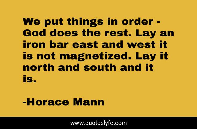 This page presents the quote "We put things in order - God does the rest. Lay an iron bar east and west it is not magnetized. Lay it north and south and it is.". Author of this quote is Horace Mann. This quote is about organization, order,.