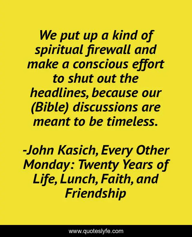 This page presents the quote "We put up a kind of spiritual firewall and make a conscious effort to shut out the headlines, because our (Bible) discussions are meant to be timeless.". Author of this quote is John Kasich, Every Other Monday: Twenty Years of Life, Lunch, Faith, and Friendship. This quote is about politics, discipleship, church-and-state, perspective,.