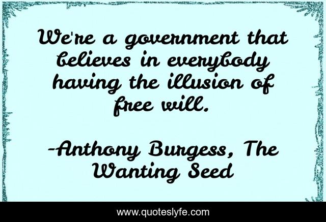 This page presents the quote "We're a government that believes in everybody having the illusion of free will.". Author of this quote is Anthony Burgess, The Wanting Seed. This quote is about oppression, free-will, state, government,.