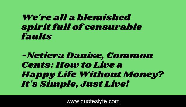 This page presents the quote "We're all a blemished spirit full of censurable faults". Author of this quote is Netiera Danise, Common Cents: How to Live a Happy Life Without Money? It's Simple, Just Live!. This quote is about confidence, life-lessons, positive, motivational, spirituality, growth, self-improvement, inspirational, self-help,.