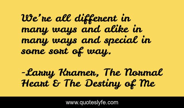 This page presents the quote "We’re all different in many ways and alike in many ways and special in some sort of way.". Author of this quote is Larry Kramer, The Normal Heart & The Destiny of Me. This quote is about different, special,.