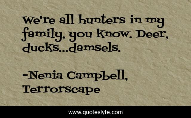 This page presents the quote "We're all hunters in my family, you know. Deer, ducks…damsels.". Author of this quote is Nenia Campbell, Terrorscape. This quote is about dark, disturbing, horror, scary,.