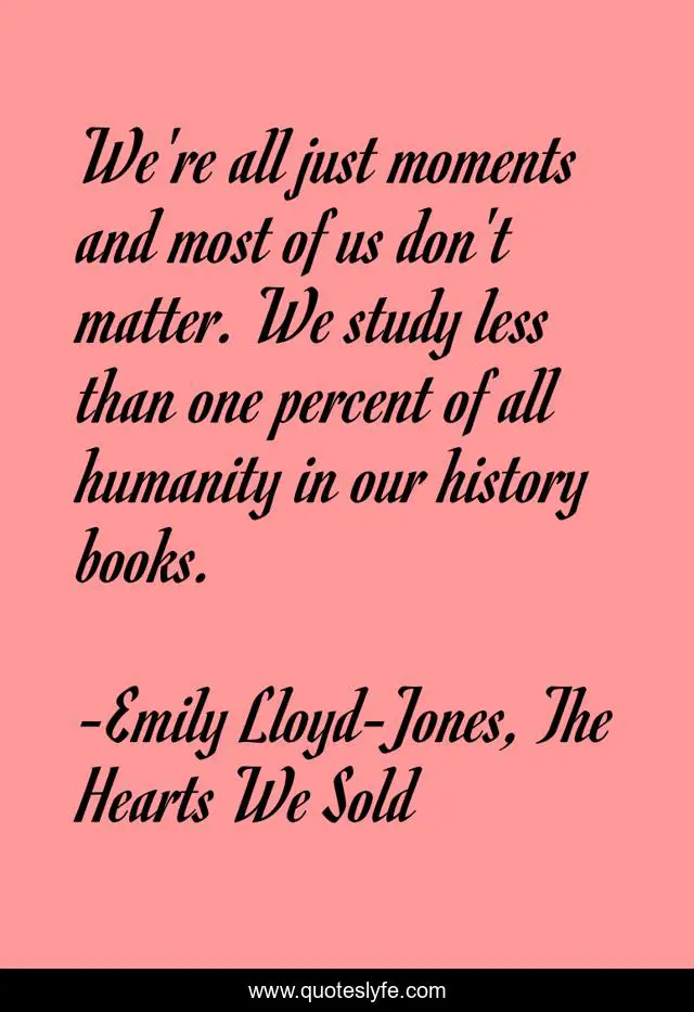 This page presents the quote "We're all just moments and most of us don't matter. We study less than one percent of all humanity in our history books.". Author of this quote is Emily Lloyd-Jones, The Hearts We Sold. This quote is about ya, demon, demons, fantasy, supernatural, fantasy-young-adult, young-adult,.