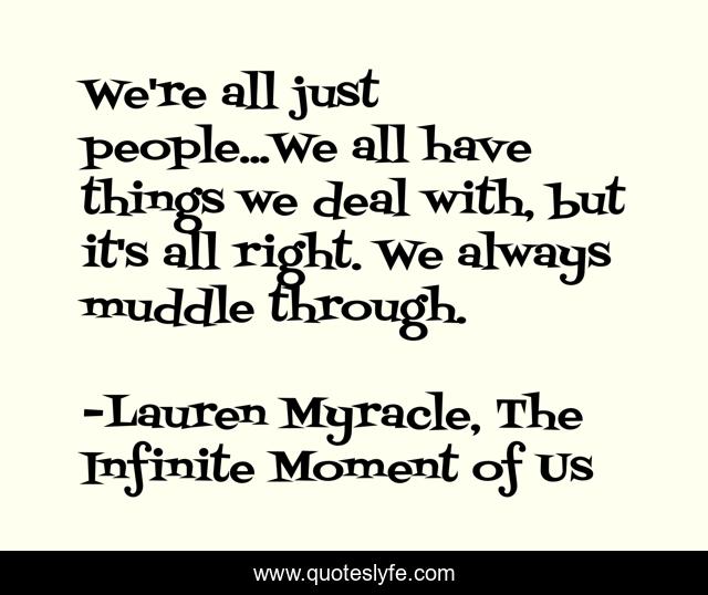 This page presents the quote "We're all just people...We all have things we deal with, but it's all right. We always muddle through.". Author of this quote is Lauren Myracle, The Infinite Moment of Us. This quote is about we-re-all-just-people, muddle-through, problems, struggles,.