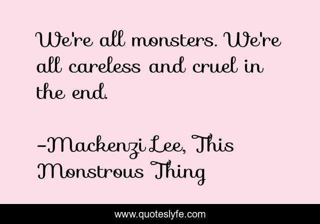 This page presents the quote "We're all monsters. We're all careless and cruel in the end.". Author of this quote is Mackenzi Lee, This Monstrous Thing. This quote is about monsters-within, humans, thought-provoking,.