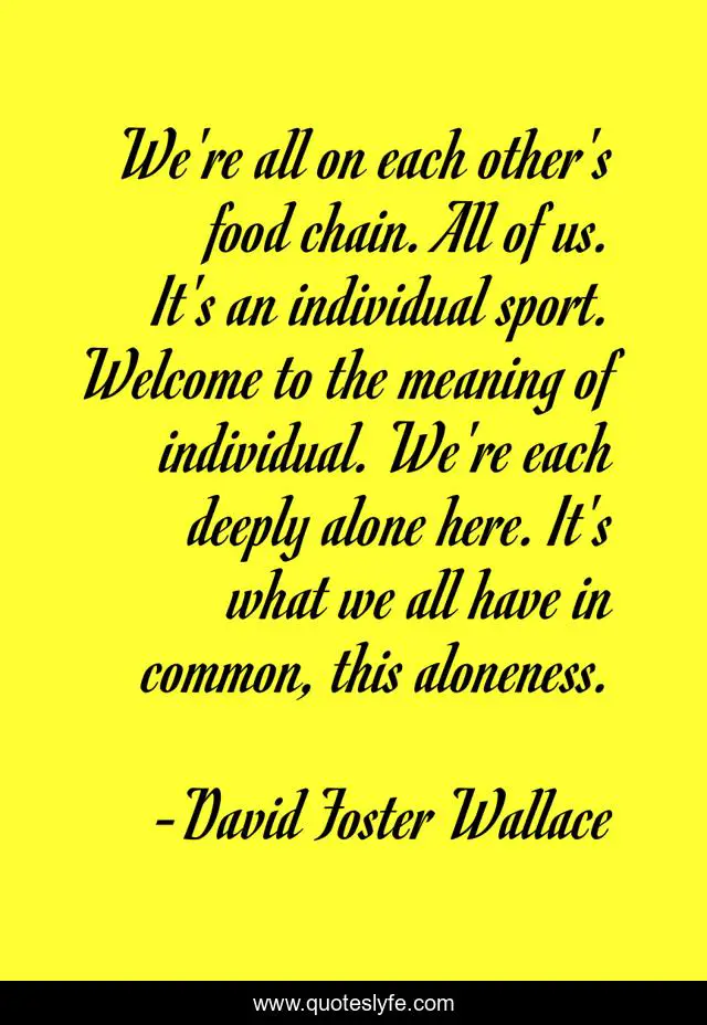 This page presents the quote "We're all on each other's food chain. All of us. It's an individual sport. Welcome to the meaning of individual. We're each deeply alone here. It's what we all have in common, this aloneness.". Author of this quote is David Foster Wallace. This quote is about alone, aloneness, individual,.