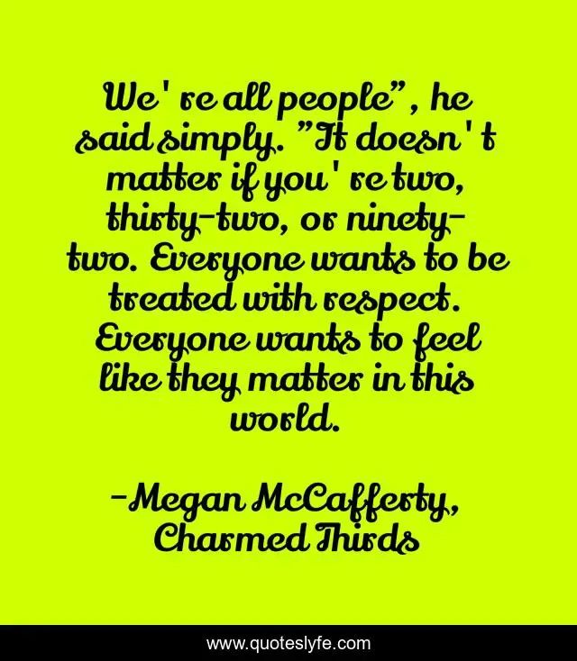 This page presents the quote "We're all people", he said simply. "It doesn't matter if you're two, thirty-two, or ninety-two. Everyone wants to be treated with respect. Everyone wants to feel like they matter in this world.". Author of this quote is Megan McCafferty, Charmed Thirds. This quote is about matter, people, respect,.