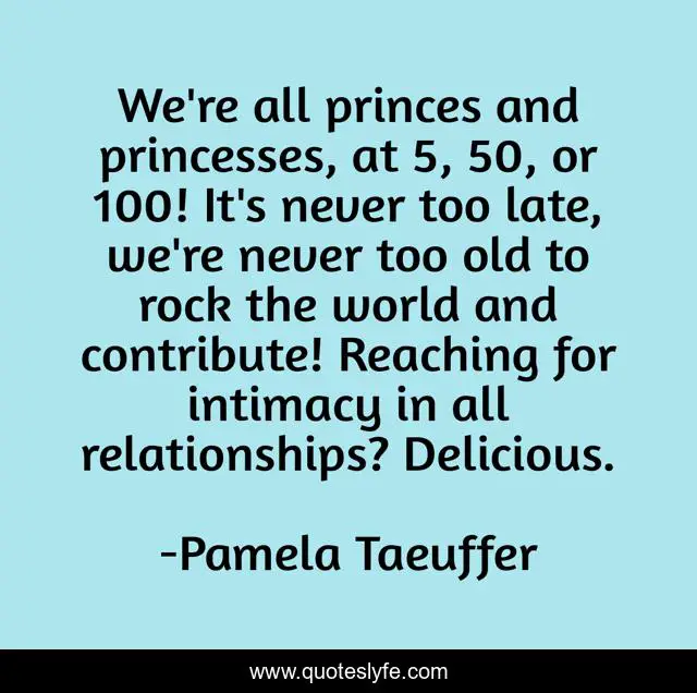 This page presents the quote "We're all princes and princesses, at 5, 50, or 100! It's never too late, we're never too old to rock the world and contribute! Reaching for intimacy in all relationships? Delicious.". Author of this quote is Pamela Taeuffer. This quote is about intimacy, romance-novels, women-s-fiction, addiction, contemporary-romance,.