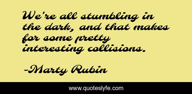 This page presents the quote "We're all stumbling in the dark, and that makes for some pretty interesting collisions.". Author of this quote is Marty Rubin. This quote is about chance, uncertainty, stumbling, the-dark,.