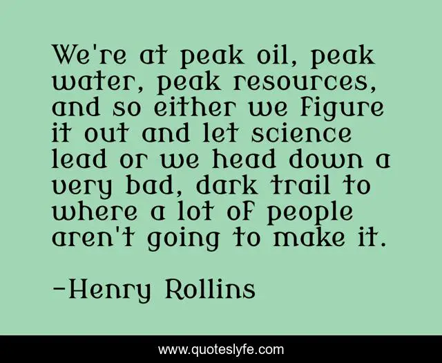 This page presents the quote "We're at peak oil, peak water, peak resources, and so either we figure it out and let science lead or we head down a very bad, dark trail to where a lot of people aren't going to make it.". Author of this quote is Henry Rollins. This quote is about water, dark, people,.