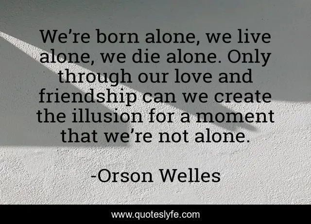 This page presents the quote "We’re born alone, we live alone, we die alone. Only through our love and friendship can we create the illusion for a moment that we’re not alone.". Author of this quote is Orson Welles. This quote is about alone, life,.