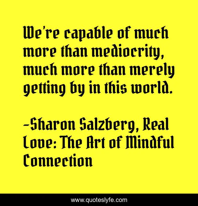 This page presents the quote "We’re capable of much more than mediocrity, much more than merely getting by in this world.". Author of this quote is Sharon Salzberg, Real Love: The Art of Mindful Connection. This quote is about love, mindfulness, positivity, mediocrity-and-happiness, mediocrity, meditation, real-love, affection,.