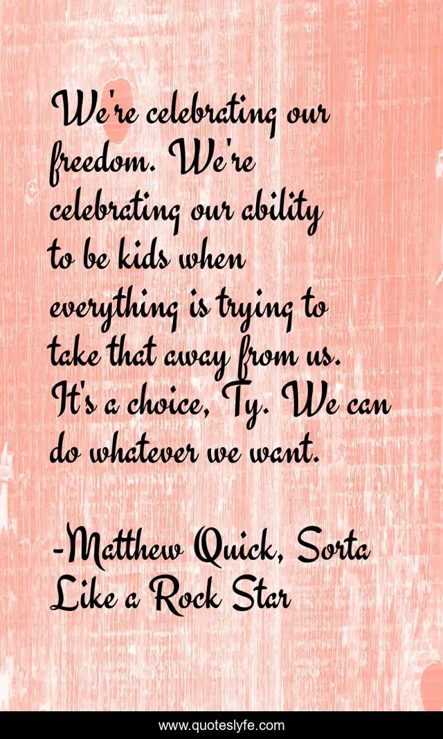 This page presents the quote "We're celebrating our freedom. We're celebrating our ability to be kids when everything is trying to take that away from us. It's a choice, Ty. We can do whatever we want.". Author of this quote is Matthew Quick, Sorta Like a Rock Star. This quote is about emotional, kids, childhood, inspirational, enthusiasm,.