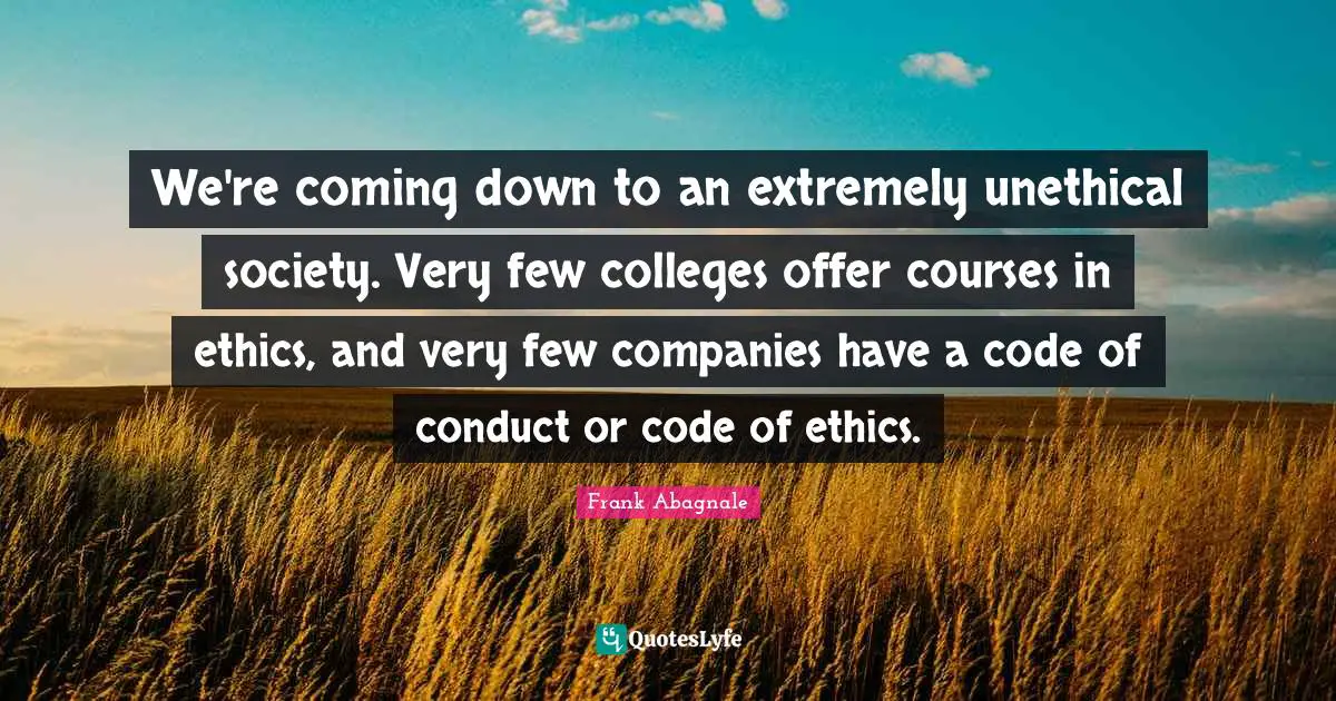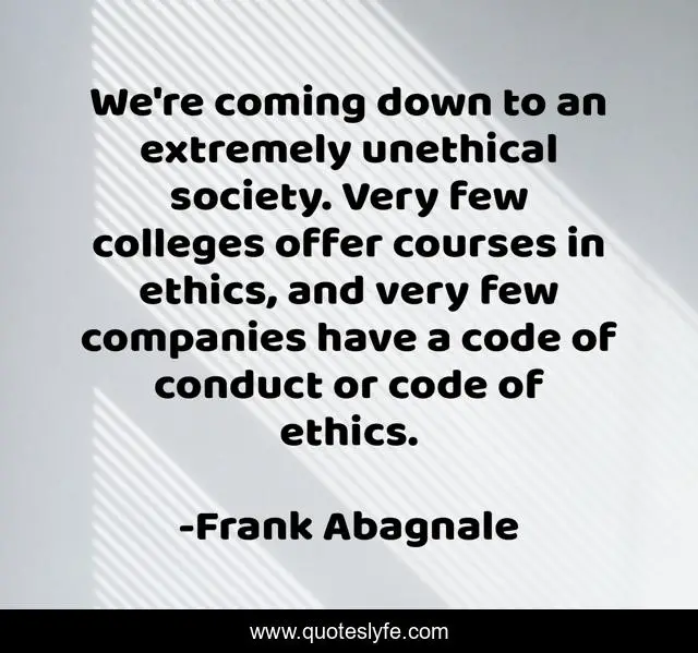 This page presents the quote "We're coming down to an extremely unethical society. Very few colleges offer courses in ethics, and very few companies have a code of conduct or code of ethics.". Author of this quote is Frank Abagnale. This quote is about down, ethics, code,.