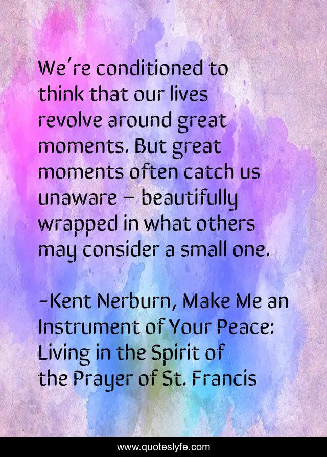 This page presents the quote "We’re conditioned to think that our lives revolve around great moments. But great moments often catch us unaware – beautifully wrapped in what others may consider a small one.". Author of this quote is Kent Nerburn, Make Me an Instrument of Your Peace: Living in the Spirit of the Prayer of St. Francis. .