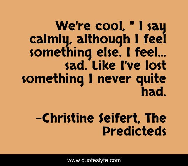 This page presents the quote "We're cool, " I say calmly, although I feel something else. I feel... sad. Like I've lost something I never quite had.". Author of this quote is Christine Seifert, The Predicteds. .