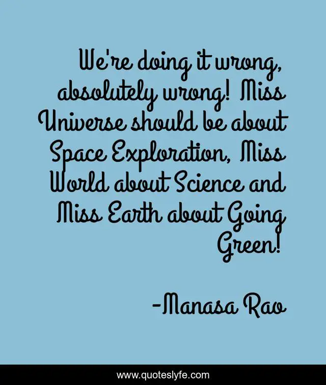 This page presents the quote "We're doing it wrong, absolutely wrong! Miss Universe should be about Space Exploration, Miss World about Science and Miss Earth about Going Green!". Author of this quote is Manasa Rao. This quote is about go-green, beauty, science, universe, competition, pageants, beauty-pageants-young-adults,.