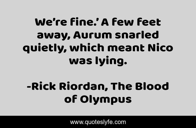 This page presents the quote "We’re fine.’ A few feet away, Aurum snarled quietly, which meant Nico was lying.". Author of this quote is Rick Riordan, The Blood of Olympus. This quote is about honesty, aurum, reyna, truth, friendship, care,.