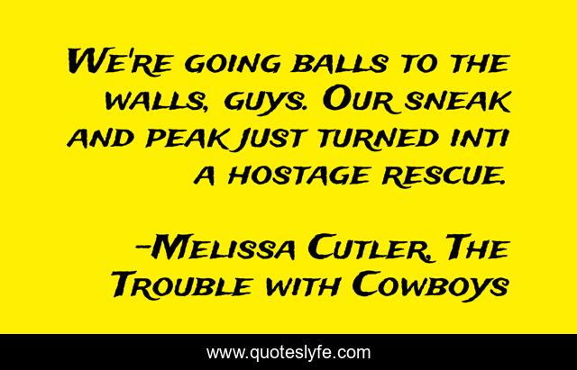 This page presents the quote "We're going balls to the walls, guys. Our sneak and peak just turned inti a hostage rescue.". Author of this quote is Melissa Cutler, The Trouble with Cowboys. This quote is about action, romance, suspense, soldiers,.