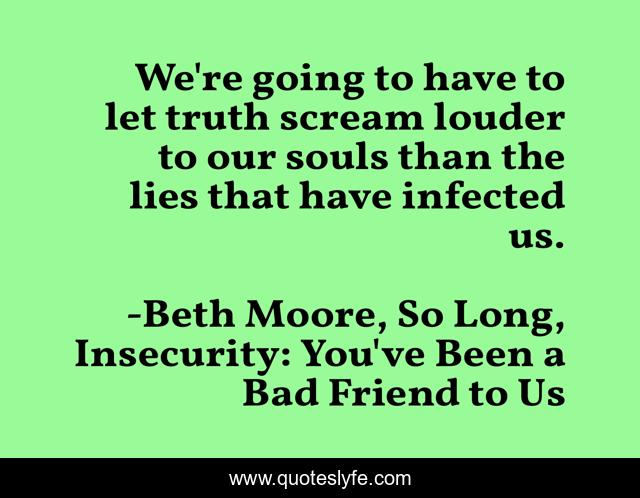 This page presents the quote "We're going to have to let truth scream louder to our souls than the lies that have infected us.". Author of this quote is Beth Moore, So Long, Insecurity: You've Been a Bad Friend to Us. This quote is about insecurity, lies,.