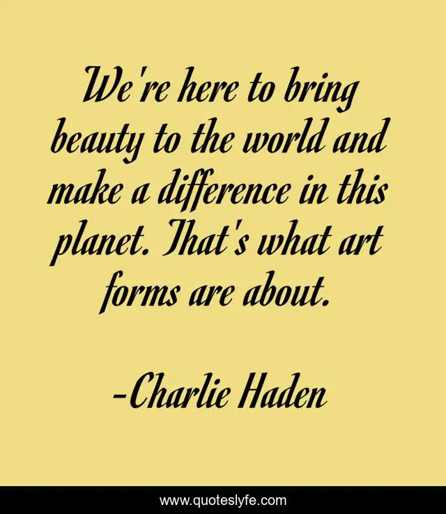 This page presents the quote "We're here to bring beauty to the world and make a difference in this planet. That's what art forms are about.". Author of this quote is Charlie Haden. This quote is about world, art,.