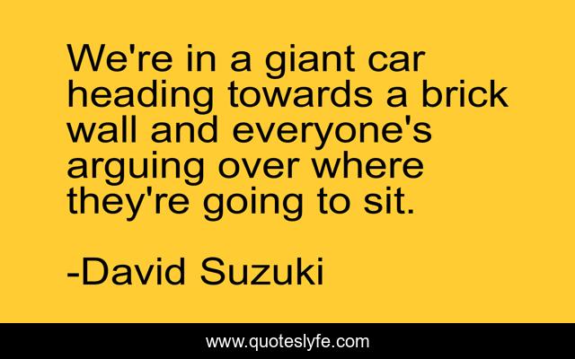 This page presents the quote "We're in a giant car heading towards a brick wall and everyone's arguing over where they're going to sit.". Author of this quote is David Suzuki. This quote is about arguing, brick, everyone,.