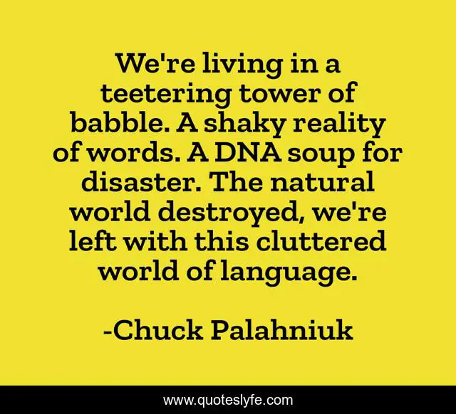 This page presents the quote "We're living in a teetering tower of babble. A shaky reality of words. A DNA soup for disaster. The natural world destroyed, we're left with this cluttered world of language.". Author of this quote is Chuck Palahniuk. This quote is about intertextuality, language, words,.