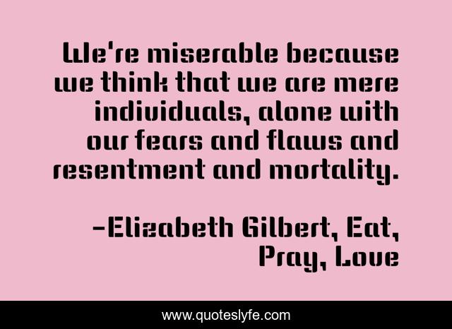 This page presents the quote "We're miserable because we think that we are mere individuals, alone with our fears and flaws and resentment and mortality.". Author of this quote is Elizabeth Gilbert, Eat, Pray, Love. This quote is about enthusiasm, inspirational, self-esteem,.