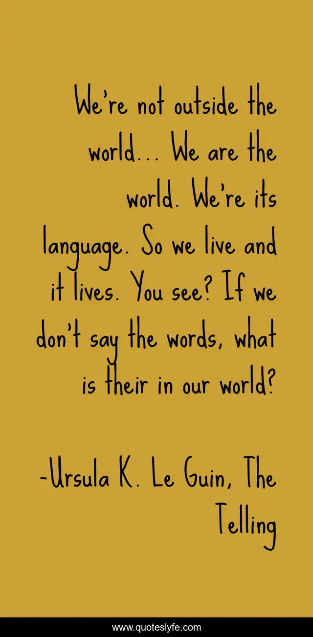 This page presents the quote "We're not outside the world... We are the world. We're its language. So we live and it lives. You see? If we don't say the words, what is their in our world?". Author of this quote is Ursula K. Le Guin, The Telling. This quote is about world, language, words,.