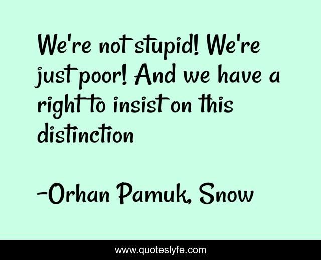 This page presents the quote "We're not stupid! We're just poor! And we have a right to insist on this distinction". Author of this quote is Orhan Pamuk, Snow. This quote is about misfortune, poverty, stupidity,.