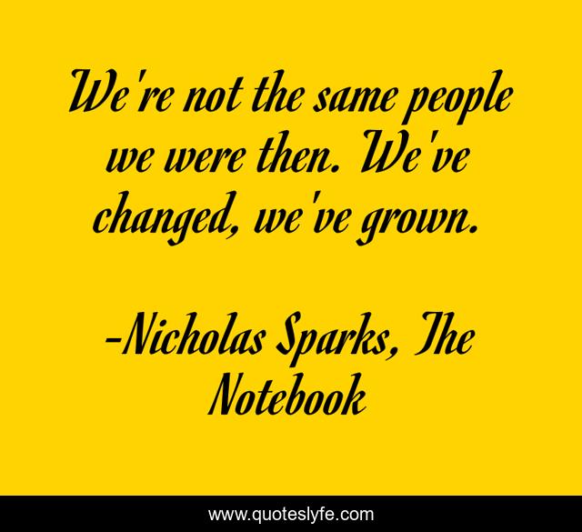This page presents the quote "We're not the same people we were then. We've changed, we've grown.". Author of this quote is Nicholas Sparks, The Notebook. This quote is about grown, change,.