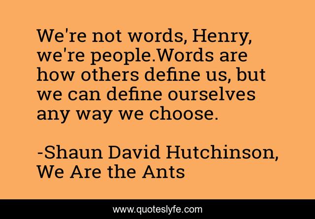 This page presents the quote "We're not words, Henry, we're people.Words are how others define us, but we can define ourselves any way we choose.". Author of this quote is Shaun David Hutchinson, We Are the Ants. This quote is about teen, loss, life, death, love, space, ya, aliens, bullying,.