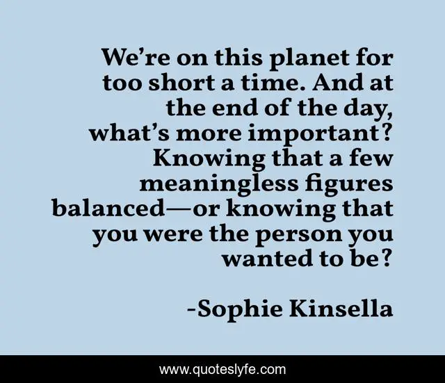 This page presents the quote "We’re on this planet for too short a time. And at the end of the day, what’s more important? Knowing that a few meaningless figures balanced—or knowing that you were the person you wanted to be?". Author of this quote is Sophie Kinsella. This quote is about enthusiasm, meaning-of-life, inspirational,.