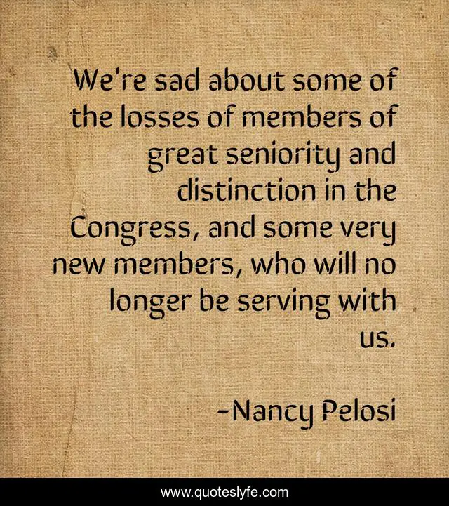 This page presents the quote "We're sad about some of the losses of members of great seniority and distinction in the Congress, and some very new members, who will no longer be serving with us.". Author of this quote is Nancy Pelosi. This quote is about new, great, serving,.