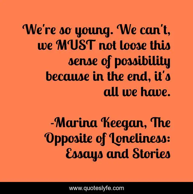 This page presents the quote "We're so young. We can't, we MUST not loose this sense of possibility because in the end, it's all we have.". Author of this quote is Marina Keegan, The Opposite of Loneliness: Essays and Stories. This quote is about the-opposite-of-loneliness, possibility, marina-keegan,.